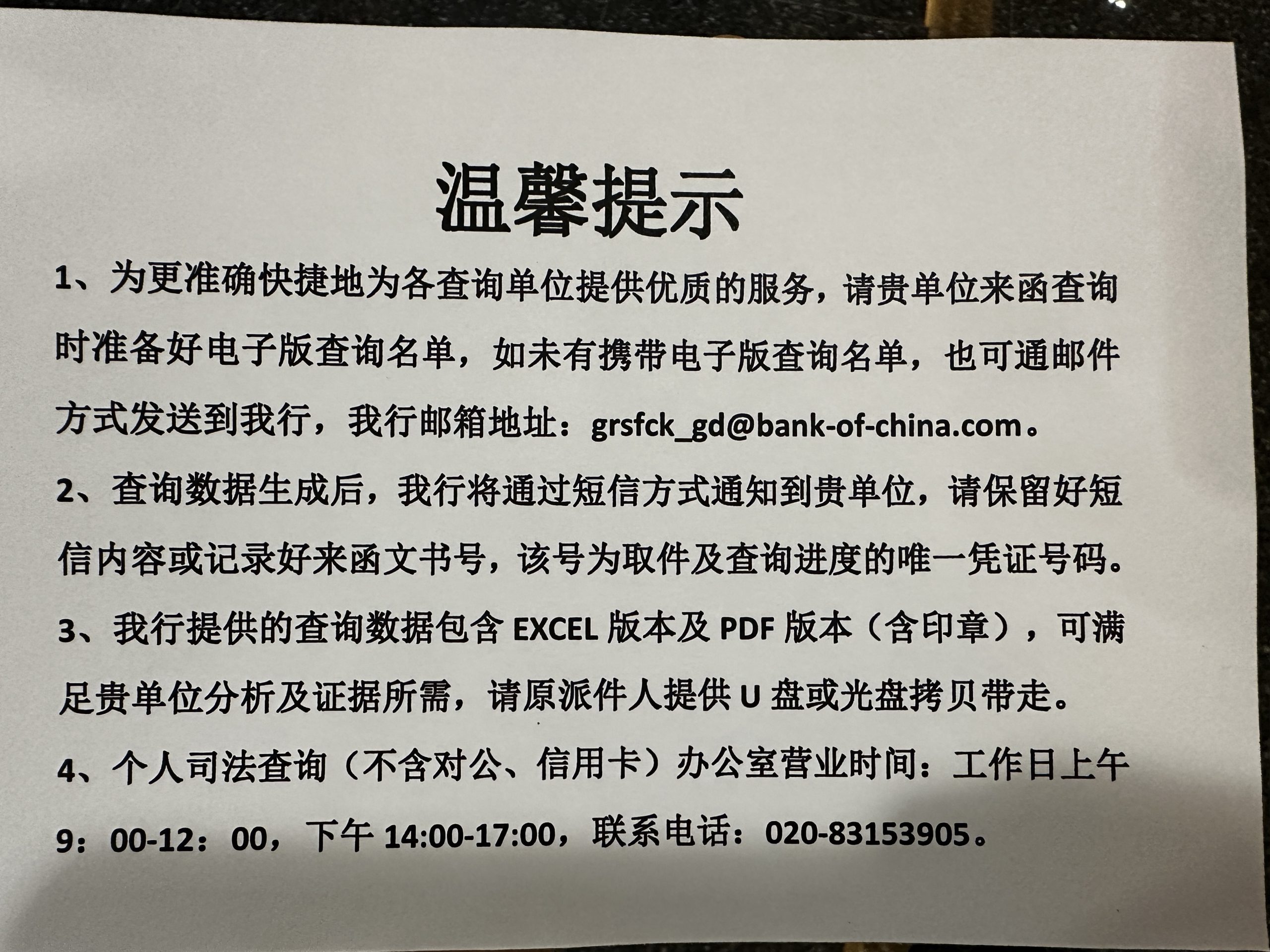 各银行流水律师调查令经验总结 中国银行: 查询地址:广东国际金融大厦东塔三楼查询办公室 调查令抬头:中国银行股份有限公司广东省分行 办结时效:五个工作日内 查询要求:可一个律师查询。 回执和结果领取:短信通知后再过来现场领取,只提供电子数据,领取时需要提供U盘或者光盘拷贝pdf材料。 联系电话:02083153905 农业银行: 查询地址:所有支行均可查询。但被建议到羊城科技大厦去司法调查。 中国农业银行股份有限公司广东省分行... 2024年03月28日 办案经验 暂无评论 喜欢 2 阅读全文