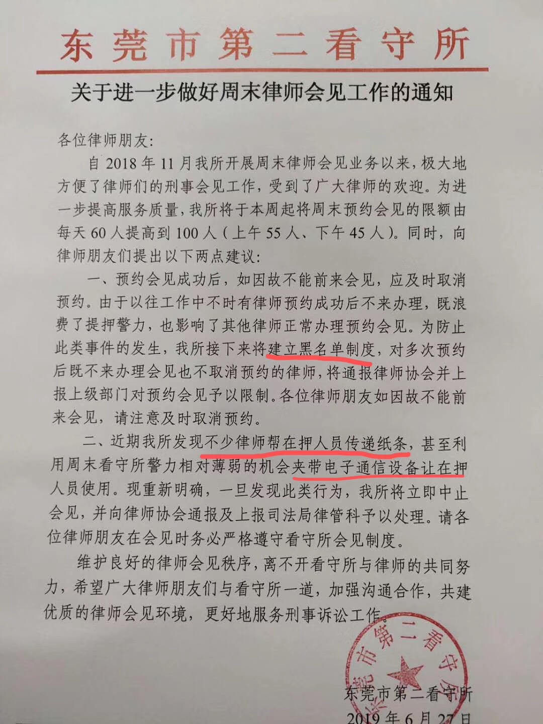 东莞市第二看守所关于进一步做好周末律师会见工作的通知