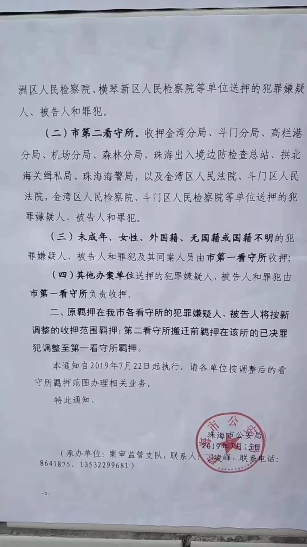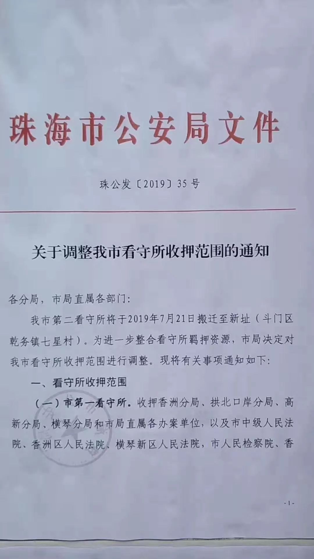 珠海市公安局关于调整我市看守所收押范围的通知(珠公发【2019】35号) | 法律笔记