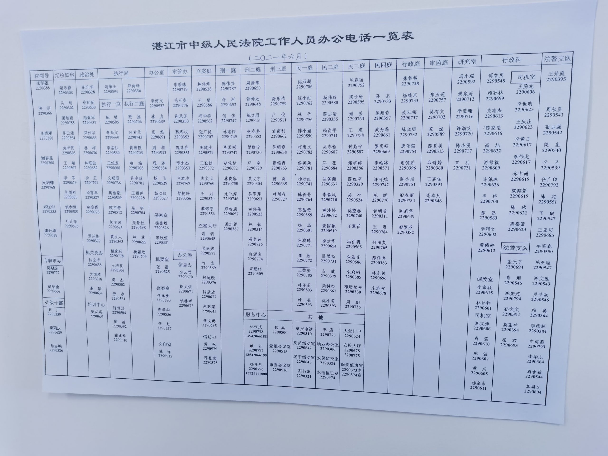 2023年湛江市中级人民法院工作人员办公电话一览表