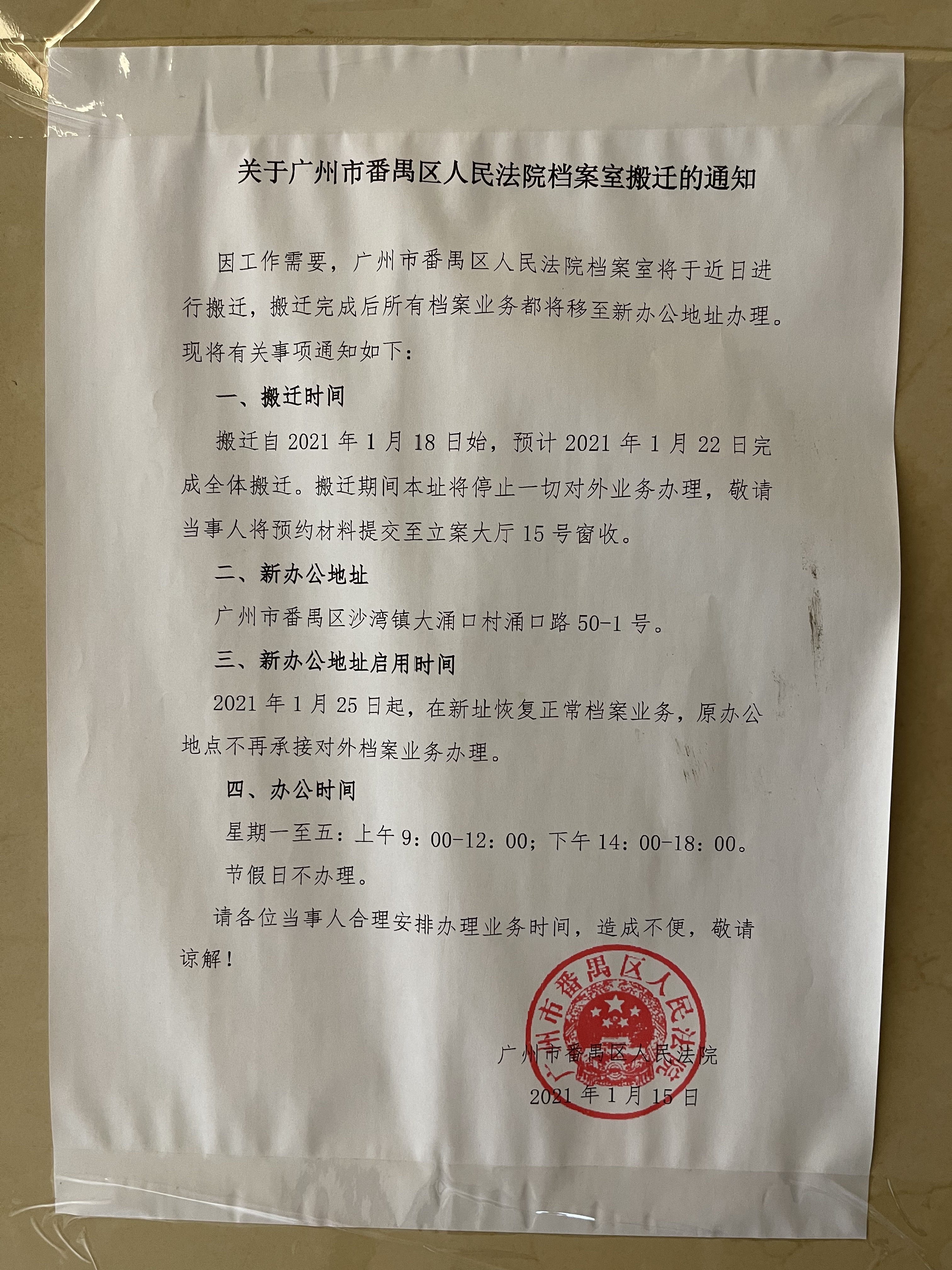 关于广州市番禺区人民法院档案室搬迁的通知(2021.01) | 法律笔记