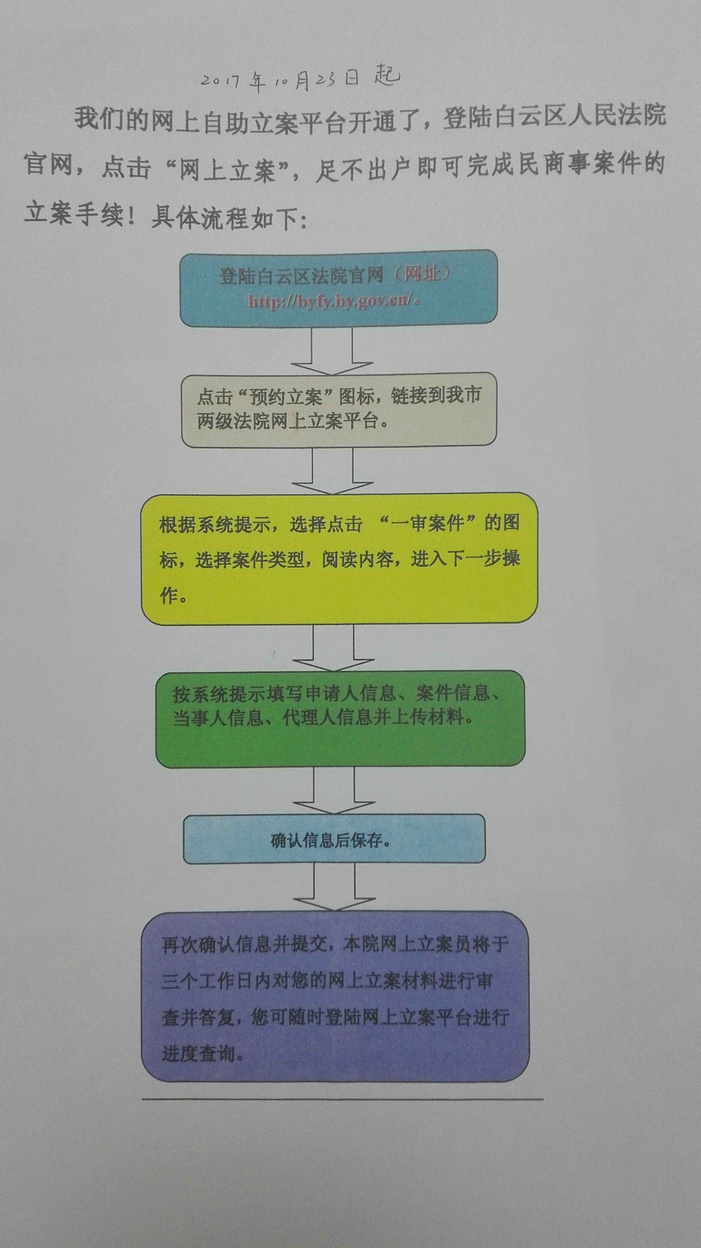 A-A+广州市白云区人民法院于2017年10月23日起开启网上立案 2017年10月23日 办案经验 暂无评论广州市白云区人民法院于2017年10月23日起开启网上立案白云法院从2017.10.23开始,窗口只受理当事人立案,财产保全,补材料的。律师办理立案手续全部实行网上扫描资料,再快递资料立案。