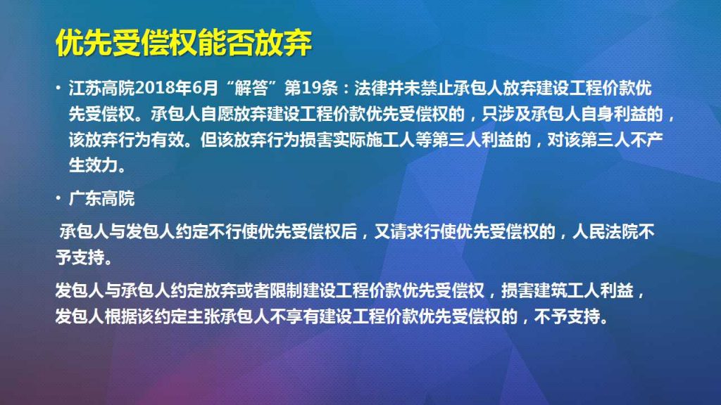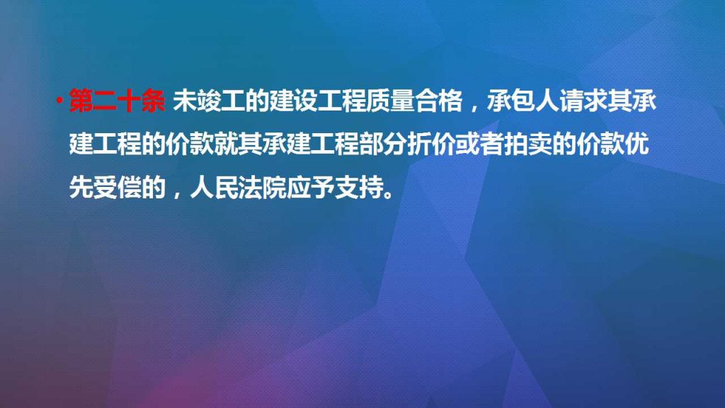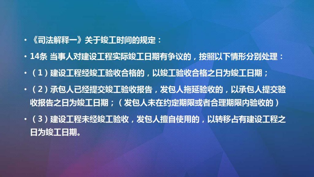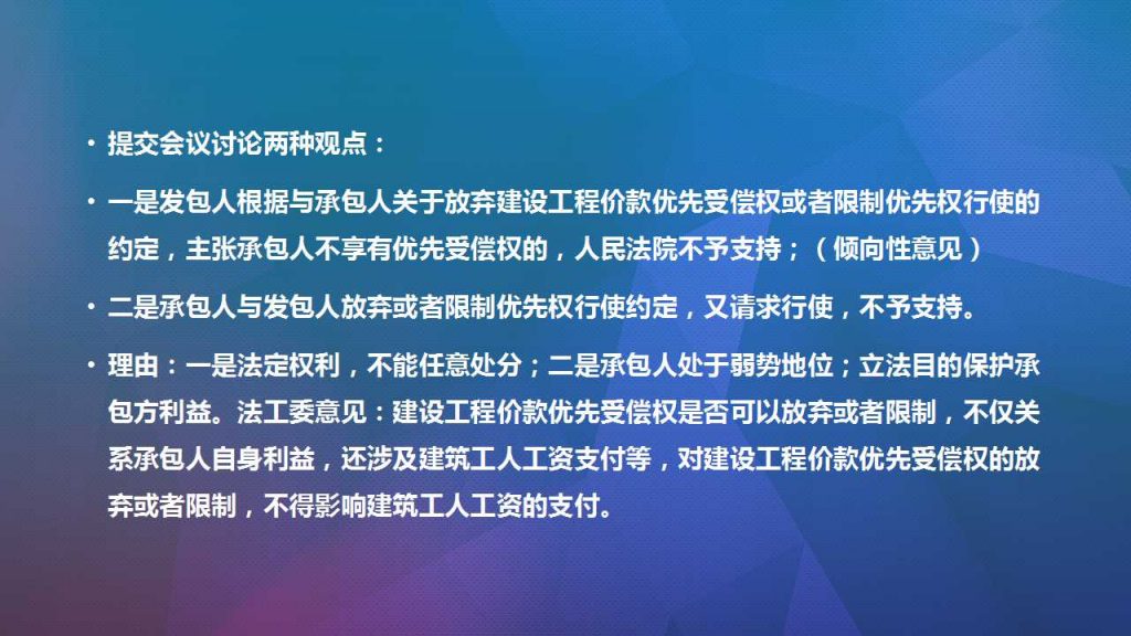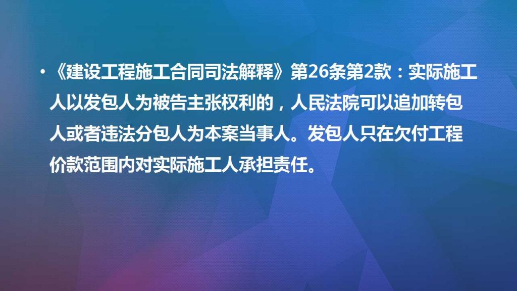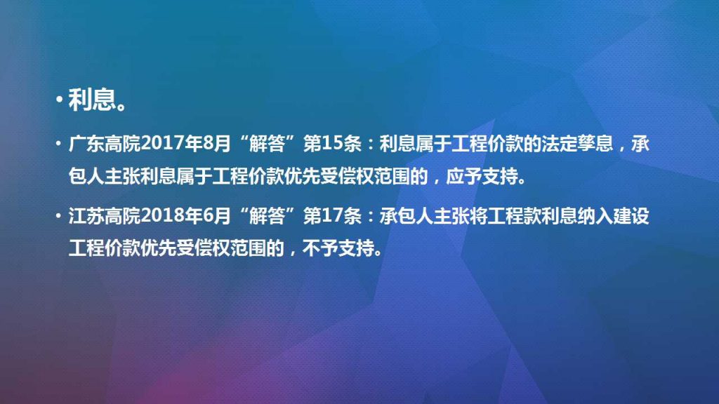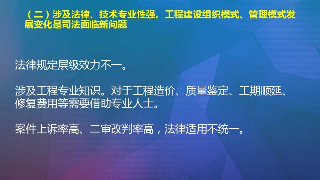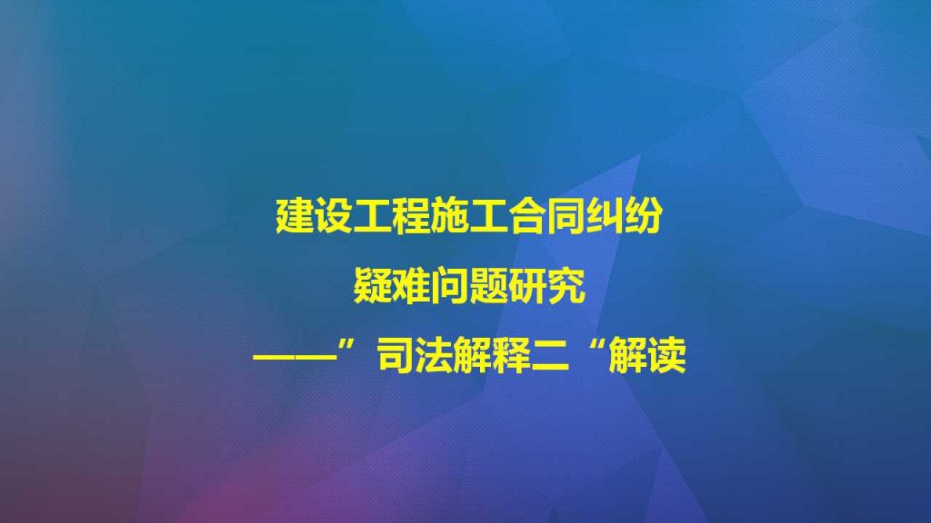 A-A+建设工程施工合同纠纷疑难问题研究——“司法解释二”解读 2019年03月06日 讲座分享 暂无评论 讲座内容《最高人民法院关于审理建设工程施工合同纠纷案件适用法律若干问题的解释(二)》起草的背景、含义、注意事项。主讲嘉宾李琪。原最高人民法院民一庭审判员、高级法官,博士研究生。担任审判长或承办大量案件。曾获全国法院优秀裁判文书一等奖,多篇文书刊登于最高人民法院公报。执笔起草消费民事公益诉讼司法解释,参与起草矿业权司法解释;建设工程司法解释二主要起草人之一。参与撰写物权法,民诉法司法解释等理解与适用等参考用书。查看文章