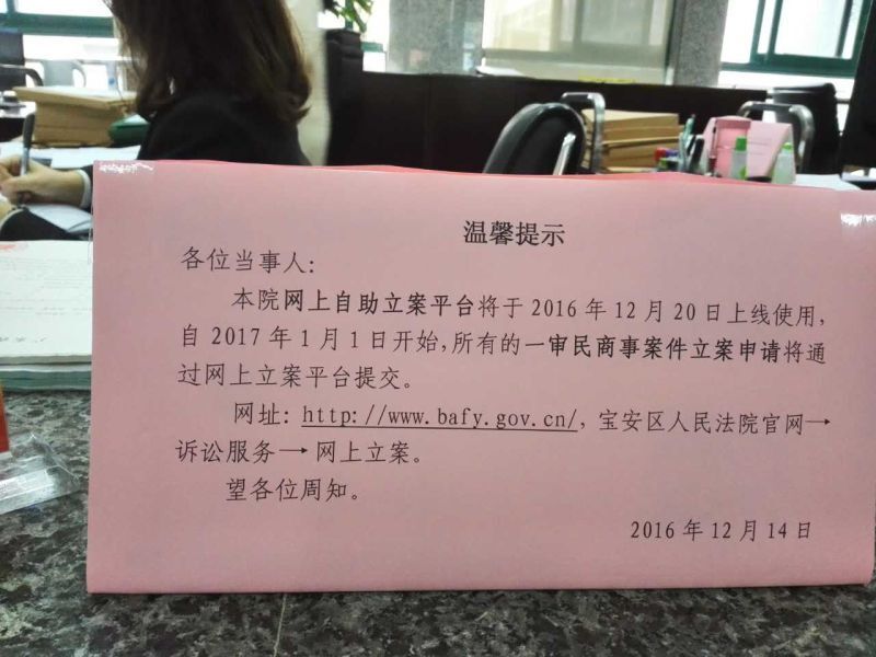 深圳市宝安区人民法院网上自助立案平台于2016年12月20日上线使用 深圳宝安法院网上自助立案平台上线使用 宝安法院从2017年1月1日开始,所有一审民商事案件立案申请将通过网上立案平台提交。网址http://www.bafy.gov.cn/,宝安区人民法院官网--诉讼服务--网上立案。 温馨提示: 1、宝安法院必须网上预约; 2、3天后审核案件通过; 3、收到通知,可以选择过来拿网上立案的案号;或者邮寄给法院(一般不建议,比较慢)。 4、如果您过来了,没法立案,还可以选择去律师之家立... 2016年12月14日 办案经验 暂无评论 喜欢 0 阅读全文
